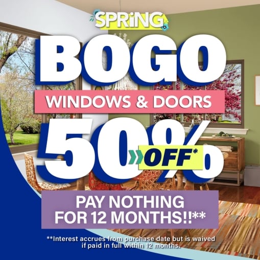 *Discount applied by retailer representative at time of contract execution and applies to purchase of 4 or more windows and/or doors. Buy two windows or doors, get the second two windows or doors, of equal or lesser value, 50% off. Discount applied to lowest priced units in purchase. Cannot be combined with other offers or prior purchases. To qualify for discount offer, initial contact for a free In-home Design Consultation must be made and documented on or before 3/31/26 with the appointment then occurring no more than 10 days after the initial contact. Promotional offer available without financing option. **Subject to credit approval. 12-month Promo Period when no payments are due and interest accrues but is waived if balance is paid in full before Promo Period expires. Any unpaid balance owed after Promo Period plus accrued interest will be paid in installments based on terms disclosed in the financing agreement. Financing is provided by various financial institutions without regard to age, race, color, religion, national origin, gender, or familial status. “Renewal by Andersen” and all other marks where denoted are marks of Andersen Corporation. ©2026 Andersen Corporation. All rights reserved.